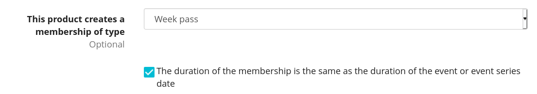 Inside the new event, you only need to create a single product which you can call “season ticket”. Inside that product’s settings, head to the “Additional settings” section and look for the option “This product creates a membership of type”. Select the membership type you just created. By default, the checkbox “The duration of the membership is the same as the duration of the event or event series date” is active, which is fine for our season ticket example, but you might need to unset it and provide custom timing for other ticket types such as week passes.