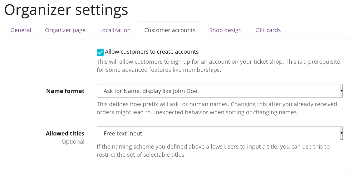 Since this approach requires customers to be identified with a customer account, you first need to enable the customer accounts feature in your organizer settings in the “Customer accounts” tab.
