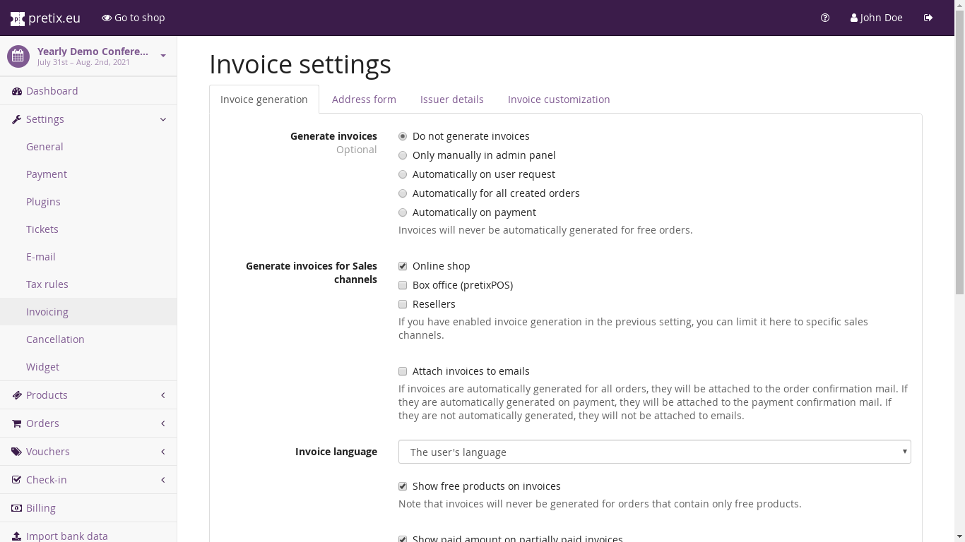 The settings at “Settings” → “Invoice” allow you to specify if and how pretix should generate invoices for your orders.