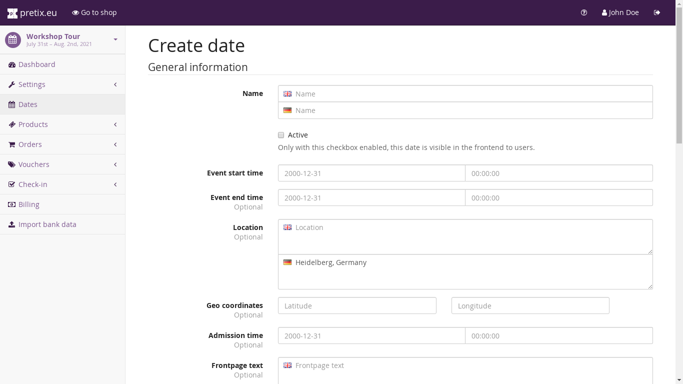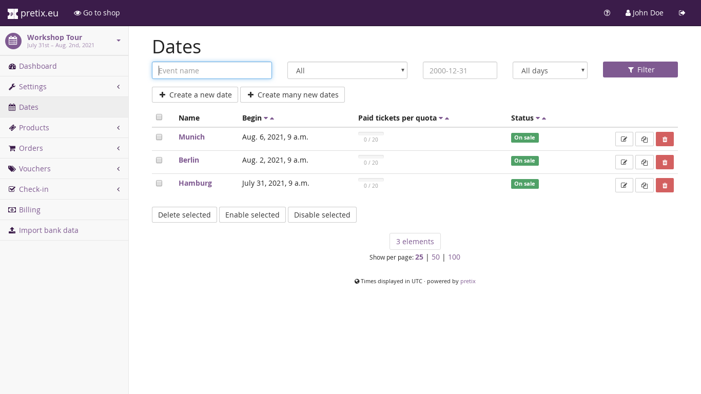 Click on “Dates” in the left navigation menu of your event. This page shows you the list of currently existing event dates and allows you to create, edit, clone and delete them.