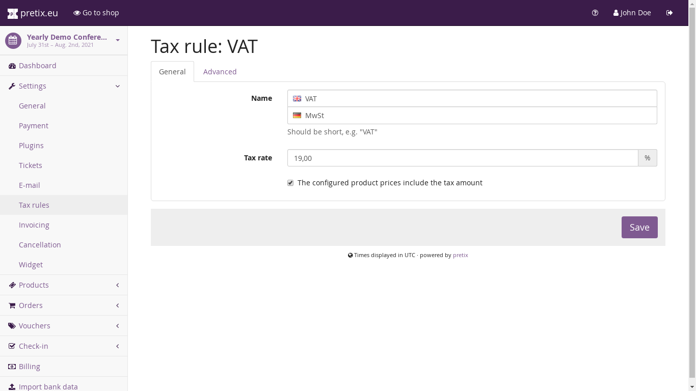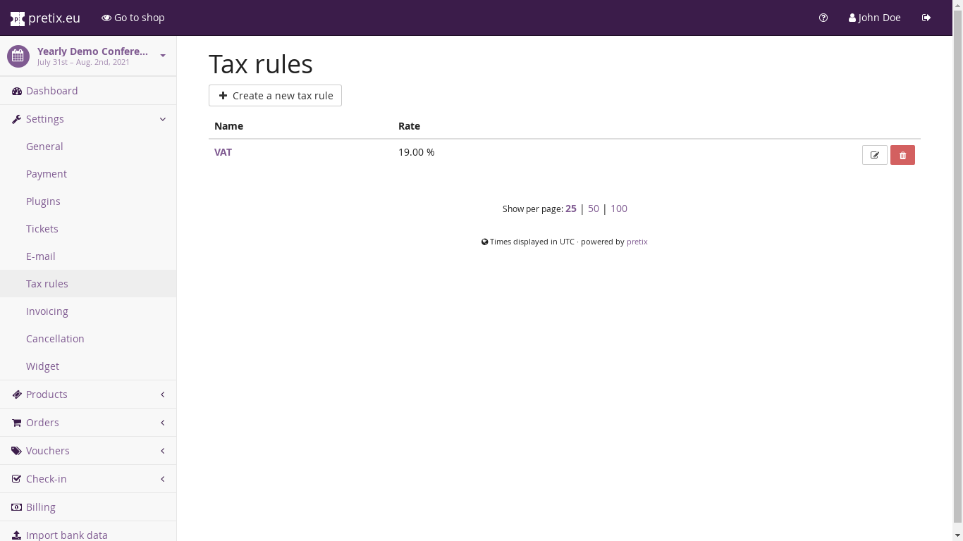 At the time of this writing, every product can be assigned exactly one tax rule. To view and change the tax rules of your event, go to the respective section in your event’s settings:
