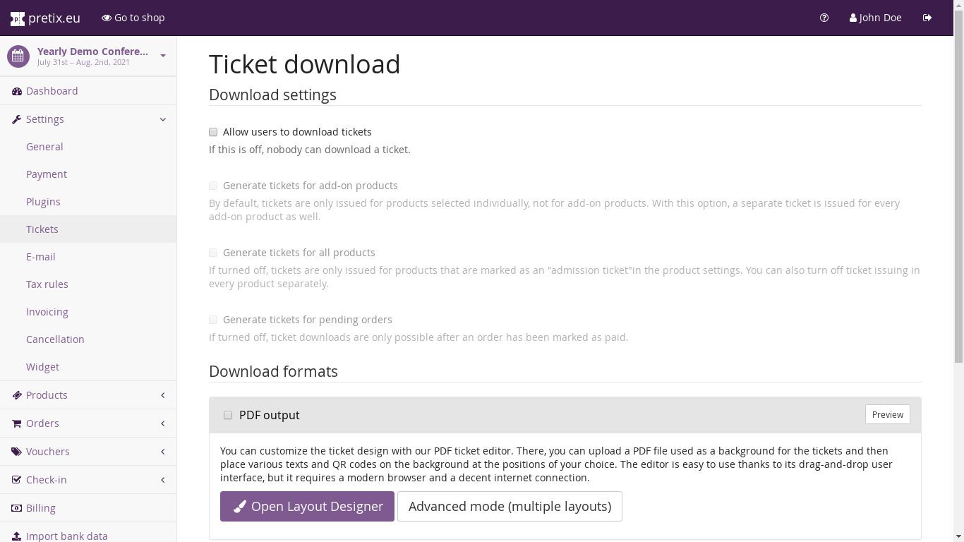 Below these settings, the detail settings for the various ticket file formats are offered. They differ from format to format and only share the common “Enable” setting that can be used to turn them on. By default, pretix ships with a PDF output plugin that you can configure through a visual design editor.